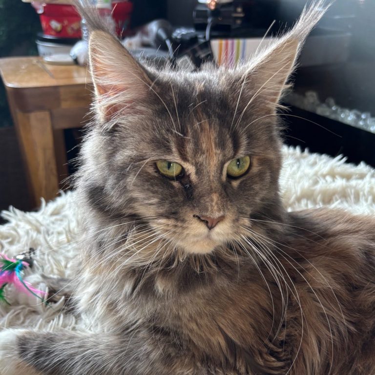 Gracie is a super affectionate, loving and playful young girl. She is always rubbing herself up against our legs, chatting away in her typical Maine Coon way and absolutely loves to oversee the house from her cat tower perch.
